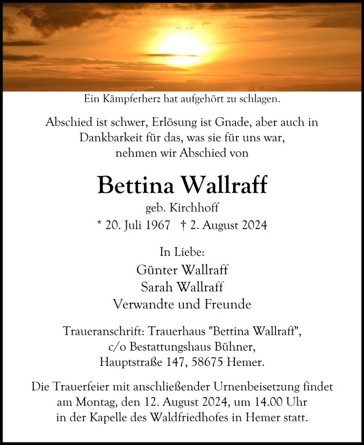 Es fällt mir unglaublich schwer, die richtigen Worte zu finden. Der Verlust von Bettina hat mich tief getroffen, und ich kann kaum begreifen, dass sie nicht mehr bei uns ist. Ich denke so oft an unsere gemeinsame Zeit auf Gran Canaria und auch hier in Deutschland zurück, an die tiefgründigen Gespräche und an die besonderen Momente, die wir geteilt haben. Bettinas Wärme und ihr offenes Herz haben mich immer wieder beeindruckt. Sie war der toleranteste Mensch, den ich je kennenlernen durfte. Ihre Fähigkeit, Menschen so anzunehmen, wie sie sind, ohne zu urteilen, war etwas ganz Besonderes und wird mir immer in Erinnerung bleiben.