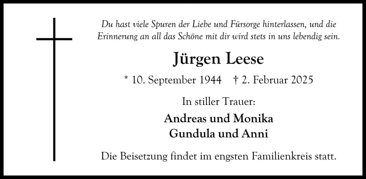 wir wünschen Ihnen für die kommende Zeit viel Kraft und dass es Ihnen gelingt, dankbar auf die positiven Erinnerungen zurückzublicken. Diese Gedenkseite möge Ihnen dabei helfen, Ihre Trauer zu teilen und das Andenken gemeinsam wachzuhalten.